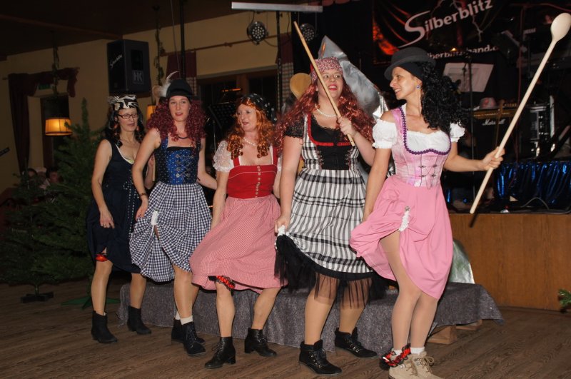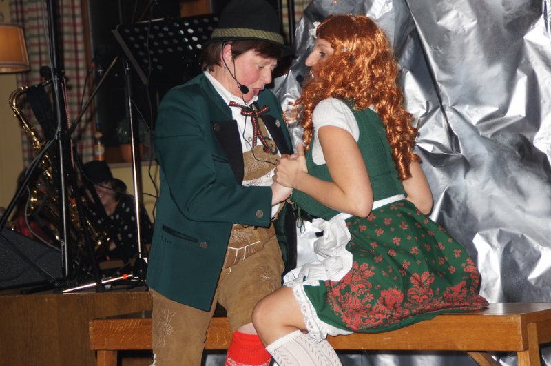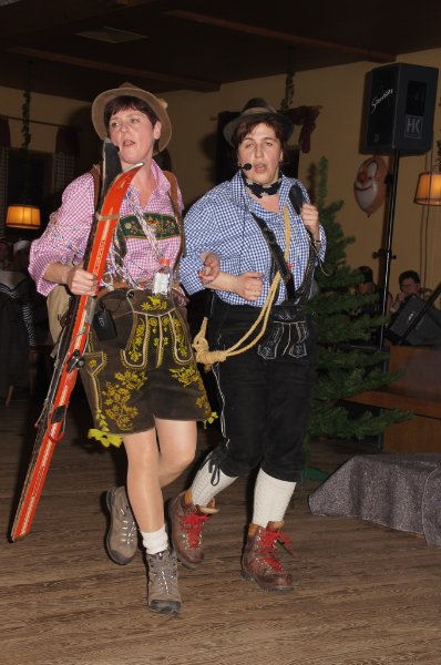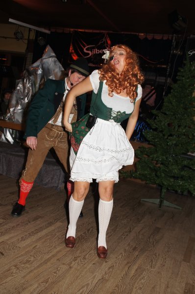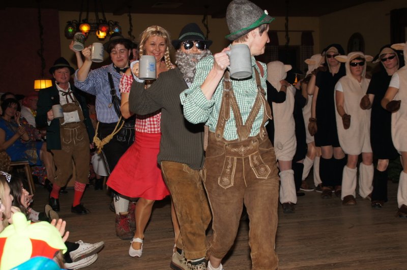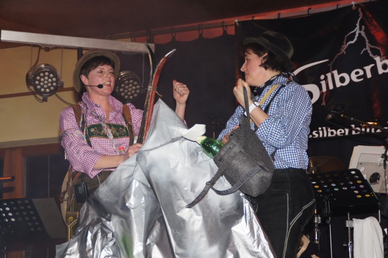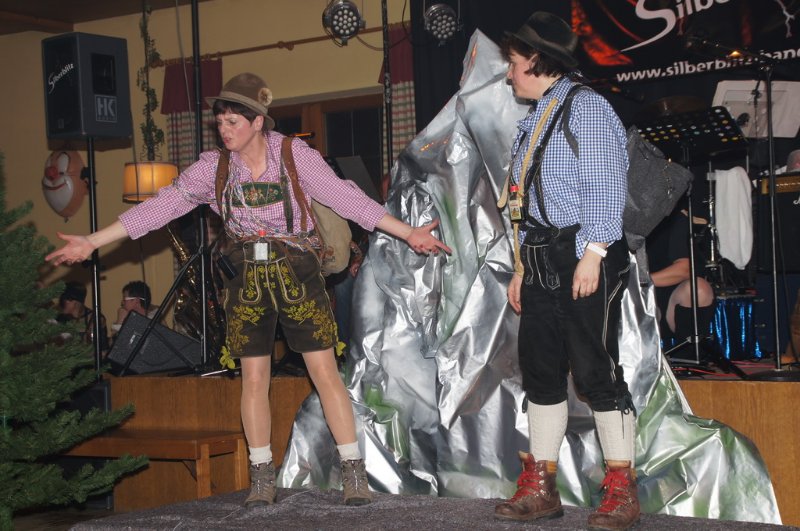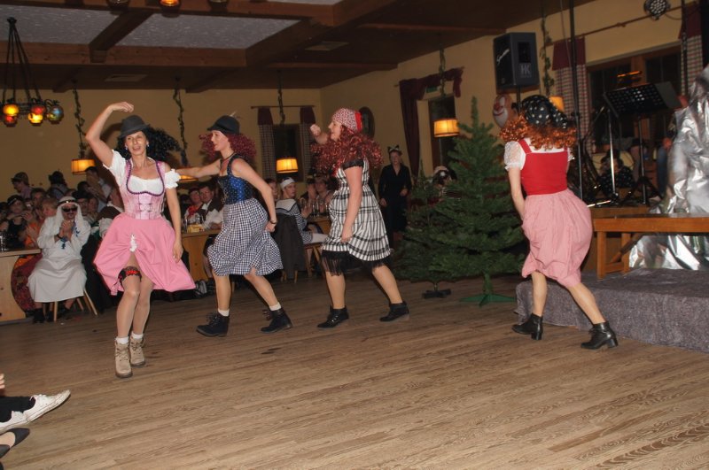 Als nächstes eroberten zwei Extrembergsteiger das Koflerhorn, mit Sauerstoffgerät, Ski und Cappuccinomaschine. Fünf Tänzerinnen zeigten einen Linedance und zu letzt waren die Geiltalerin und der Bub im Saal. Nach weiteren Tanzrunden zeigten „de Middlschoafn“ ihre Einlage, und tanzten als Gockel verkleidet. Nach ihrer Zugabe wären sie jedoch bald beim Koch im Suppentopf gelandet.